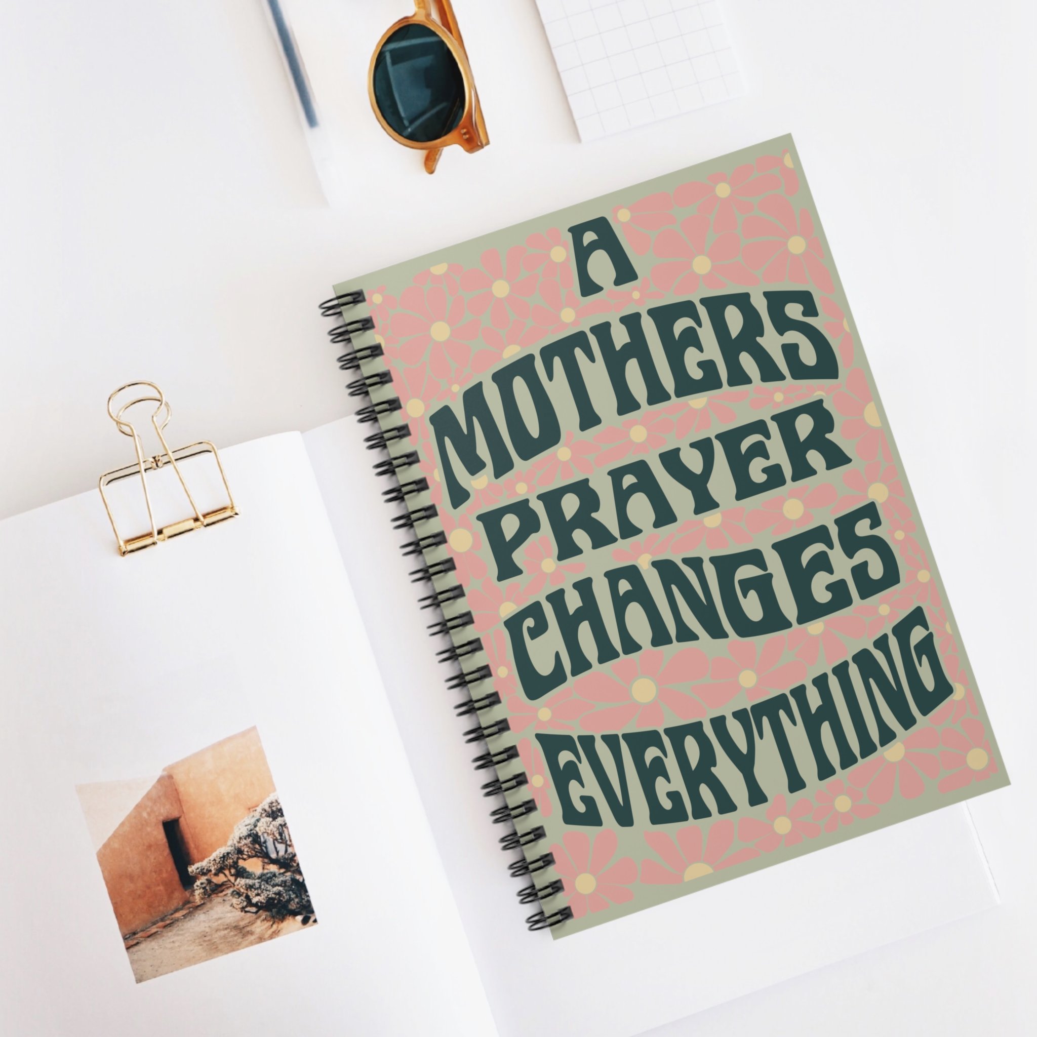A Mother's Prayer changes everything in a vintage 60s style image with pink flowers on a green background. This Spiral Notebook brings a nostalgic and inspirational feel, perfect for journaling and note-taking. Ideal for mothers, spiritual individuals, and those who appreciate retro designs. Relevant for Mother's Day, birthdays, or any occasion where a thoughtful gift is appreciated.